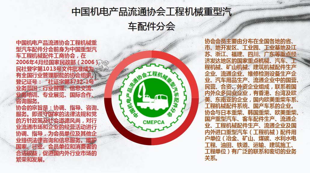 主持人:冯满 佛山市满亿信息科技有限公司总经理,该公司经营范围:信息技术咨询服务、协会活动、展览服务、贸易代理。最具代表性的产品有泰斯福德汽车轮胎防爆装置,为阻止车辆爆胎事故而生,可以称得上是一款保命神器! 交流会上,中国机电产品流通协会工程机械重型汽车配件分会会长韩宗师先生为莅临本次会议的嘉宾们致欢迎词,并介绍了“中国机电产品流通协会工程机械重型汽车配件分会”的发展历程。