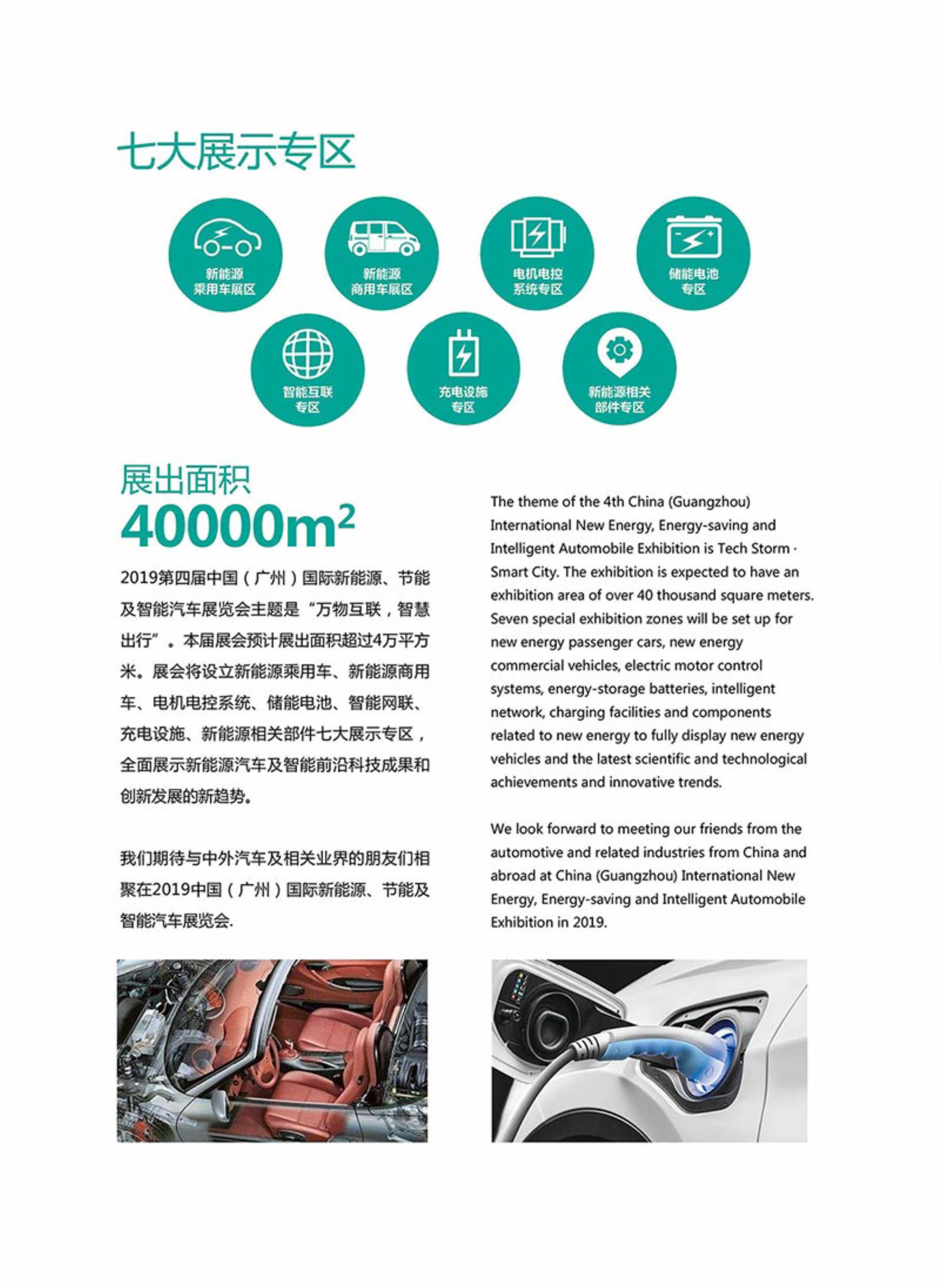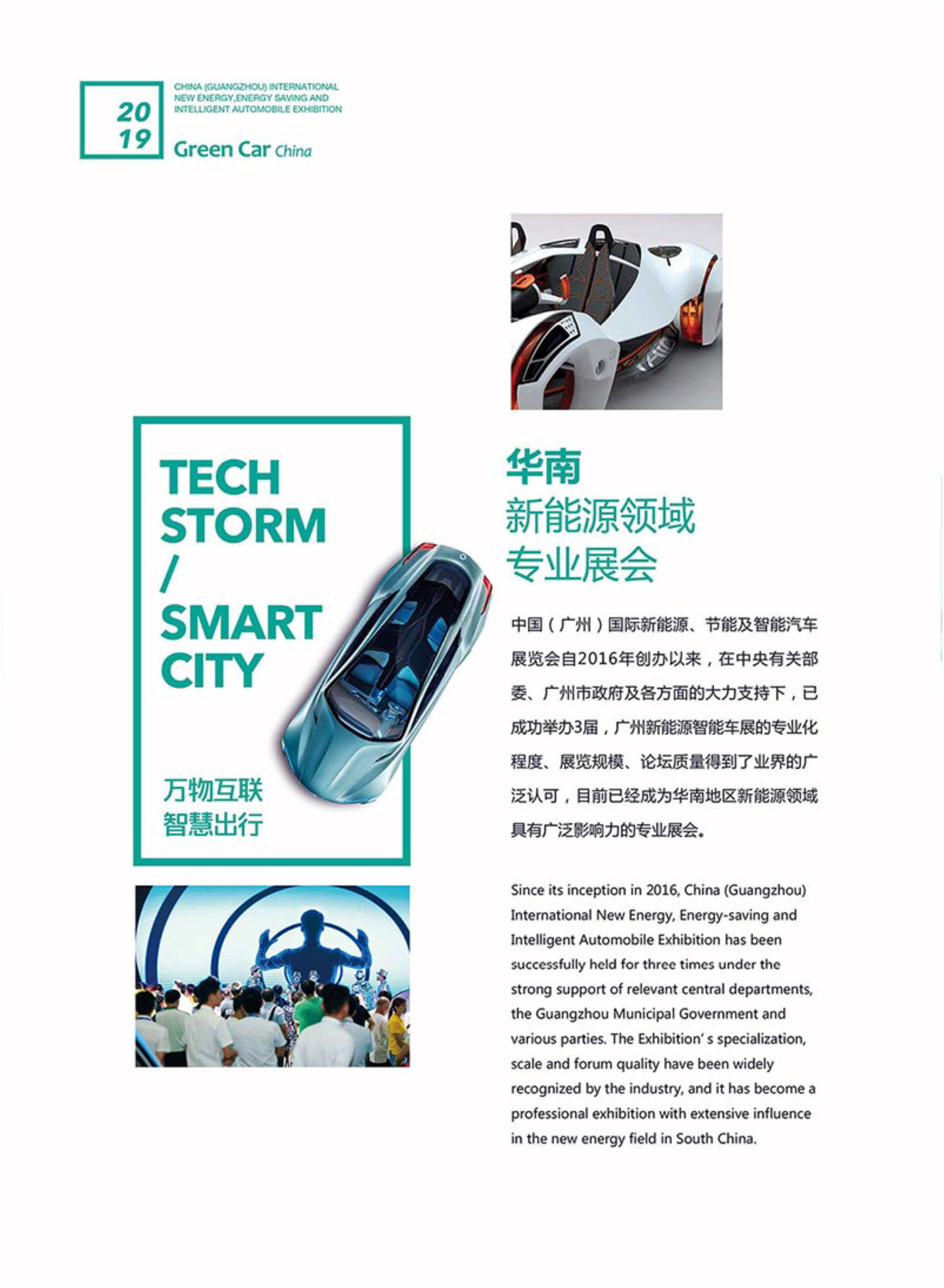 2019第四届中国(广州)国际新能源、节能及智能汽车展览会主题是“万物互联,智慧出行”。展会将设立新能源乘用车、新能源商用车、电机电控系统、储能电池、智能网联、充电设施、新能源相关部件七大展示专区,全面展示新能源汽车及智能前沿科技成果和创新发展的新趋势。